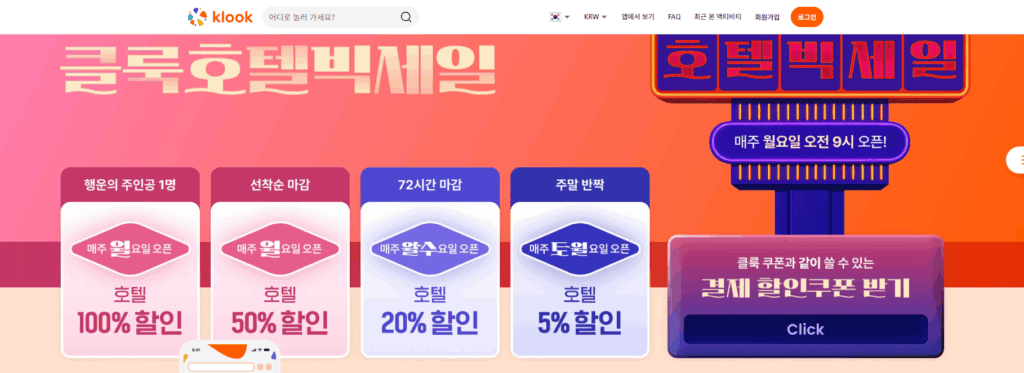 이번에 클룩에서 호텔빅세일을 진행하고 있어 매주 월요일 할인 쿠폰을 뿌리고 있는데요, 최대 100%(1명) 할인 받을 수 있다고 해요!