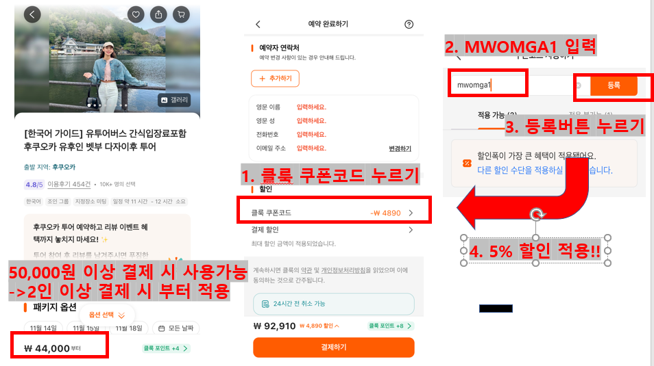 할인코드는 MWOMGA1이고요, 클룩 쿠폰코드를 누르면 쿠폰번호를 입력하는 란이 나오는데, 거기에 입력하시고 등록하여 사용하시면 됩니다.